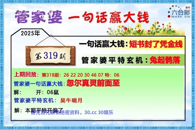 319期:管家婆一句话:【短书封了凭金线】 解:短书解出书肖龙虎马,平特玄机是兔起鹊落的意思是比喻绘画创作的迅捷状态。 综合:狗鸡蛇猴马龙 |